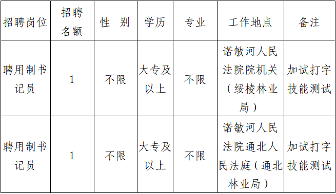 1.聘用制书记员岗位:诺敏河人民法院院机关1人、通北人民法庭1人;