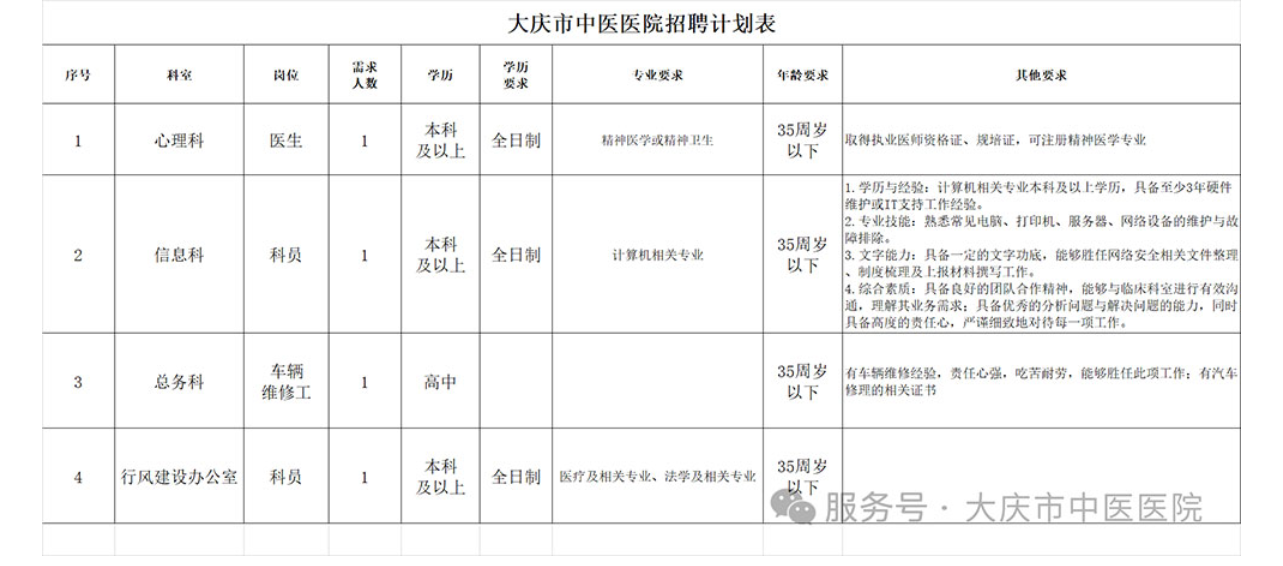因工作需要,现大庆市中医医院拟招聘工作人员,具体要求如下: