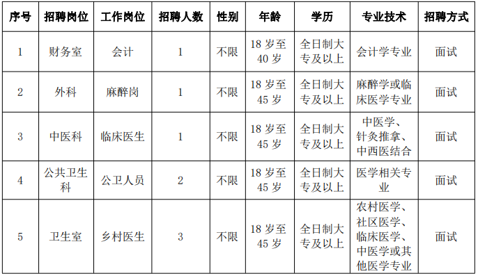 本次计划招聘编外合同制人员共8名,五个岗位,财务室岗位1名、外科麻醉师岗位1名、中医科临床医生岗位1名、公共卫生科岗位2名、乡村医生3名。