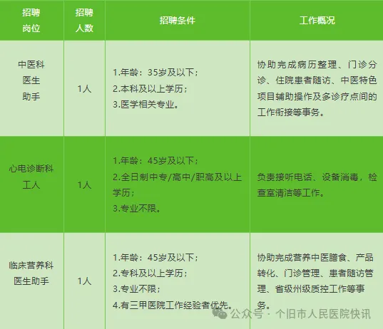 根据医院业务发展需求,我院中医科、心电诊断科、临床营养科需招聘劳务派遣工作人员3名,具体招聘条件如下: