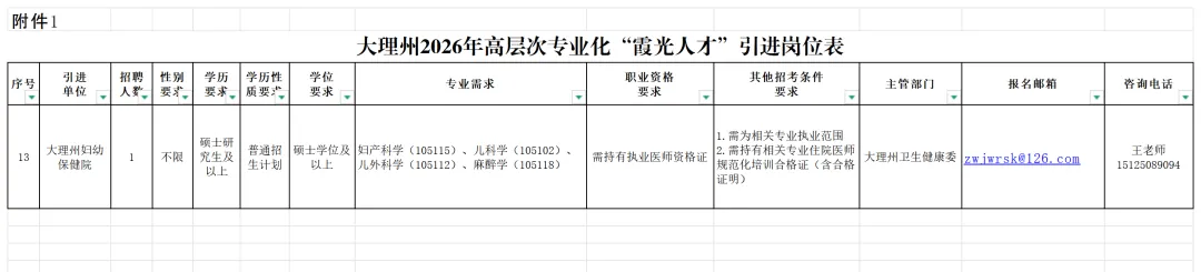 大理白族自治州妇幼保健院建院于1972年6月,是一所具有公共卫生性质的公益性事业单位,集预防、保健、医疗、教学、培训和科研为一体的三级甲等妇幼保健院。为深入实施“人才强院”战略,根据《大理州2026年高层次专业化“霞光人才”引进公告》,医院拟通过高层次专业化“霞光人才”引进临床医生1名,详细事宜如下: