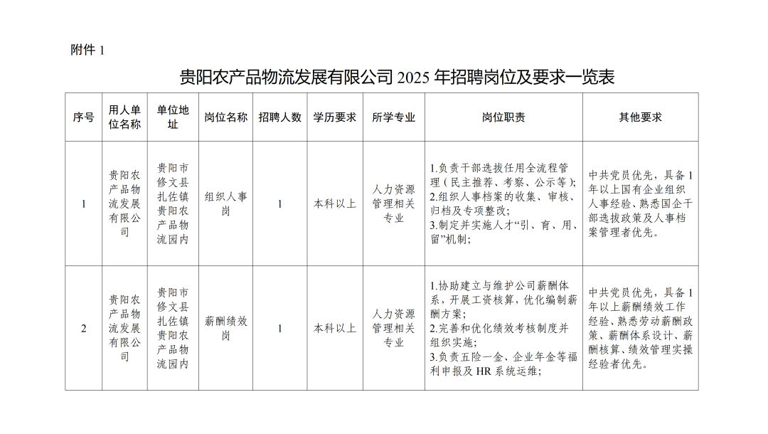 本次公开招聘2个岗位,共计2人,其中组织人事岗1名、薪酬绩效岗1名。具体岗位要求详见贵阳农产品物流发展有限公司2025年招聘岗位及要求一览表。