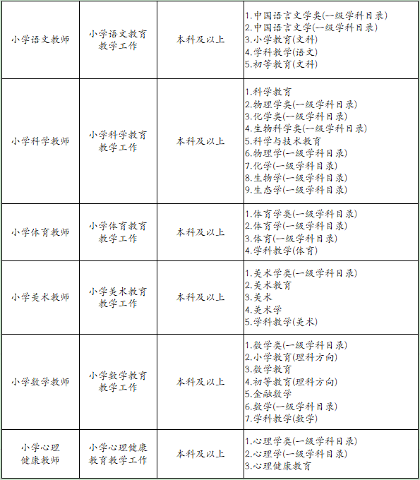 小学语文、数学、美术、体育、科学、心理健康学科教师。