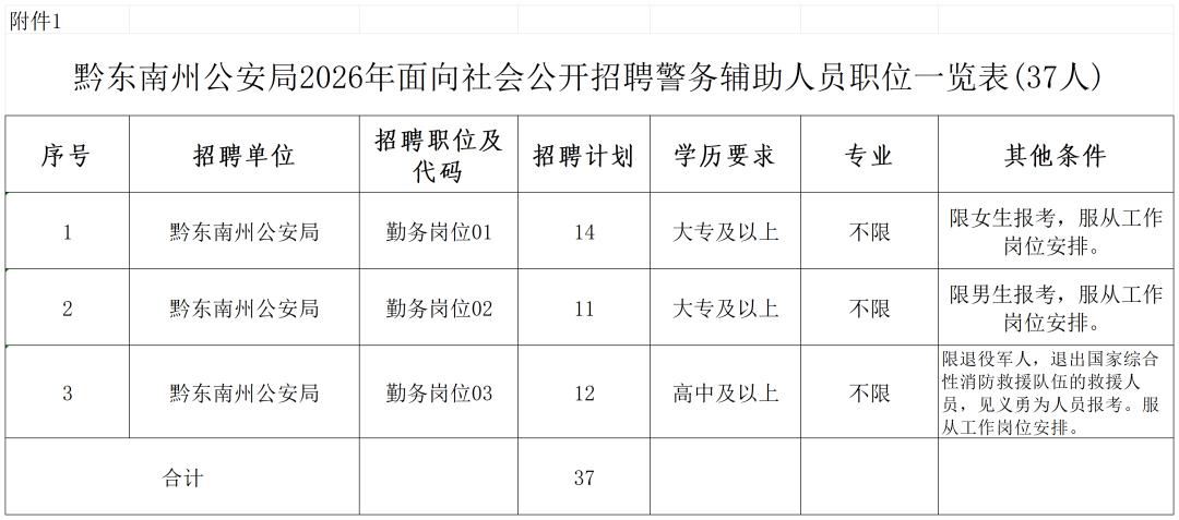 本次公开招聘警务辅助人员共37名,主要为公安机关日常警务活动及相关工作提供辅助支持,由公安机关直接管理,不具有国家公务员、人民警察和事业单位工作人员身份。具体岗位详见《黔东南州公安局2026年面向社会公开招聘警务辅助人员职位一览表》(附件1)。