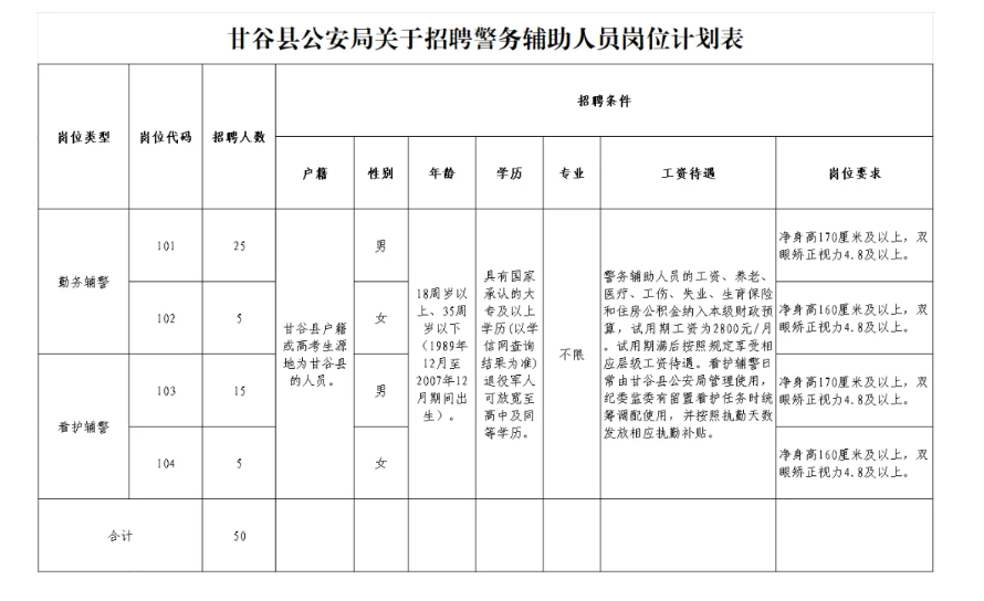 计划公开招聘辅警共计50名,其中勤务辅警30名,留置看护辅警20名,具体岗位详见《甘谷县公安局关于招聘警务辅助人员岗位计划表》(简称岗位计划表)。同时,建立后备人员库30名(勤务辅警20名,其中男性15名,女性5名;留置看护辅警10名,其中男性5名,女性5名。有效期至新一轮辅警招聘公告发布之日)。本次公开招聘警务辅助人员身份为合同制聘用人员,属公安辅警性质,不占用编制,不享受人民警察待遇,纳入本级公安辅警队伍,实行层级化管理。