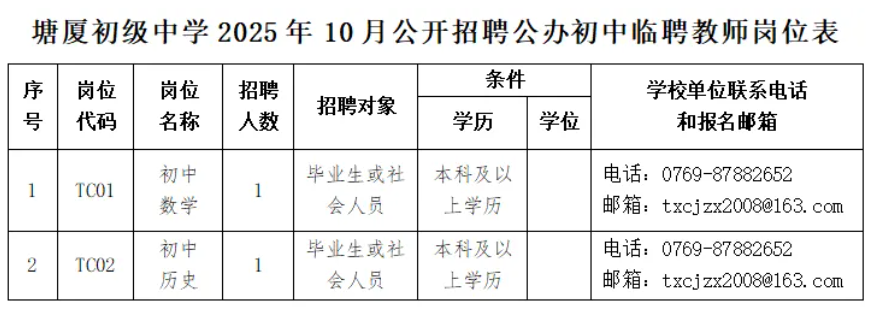 为进一步满足学校教育教学发展需求,塘厦初级中学面向全国社会人员或毕业生公开招聘编外教师2名。