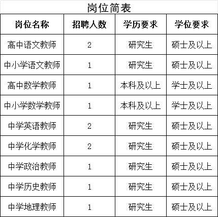 岗位需求:中小学语文、数学,中学英语、化学、政治、历史、地理教师。(具体岗位详见天河区教育局公告附件)