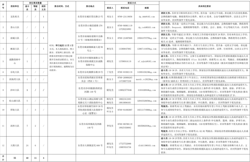 具体详见《东莞市消防救援支队政府专职消防员招录岗位一览表》(附件1)。