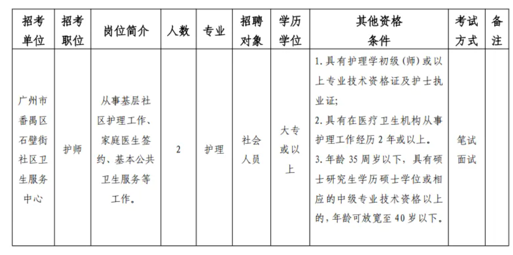 2.其他条件(详见《广州市番禺区石壁街社区卫生服务中心2025年招考编外人员职位表》)。