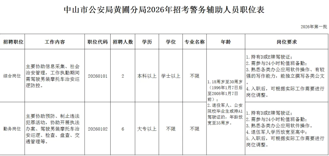 本次共招考警务辅助人员8名,能胜任夜间值班、巡逻工作,需24小时值班,具体职位详见上表。