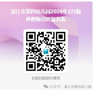 湛江市第四幼儿园位于湛江市霞山区海昌路26号,是广东省一级幼儿园,是霞山区公办幼儿园。根据工作发展需要,现面向社会招聘(非编制)幼儿园教师。现将有关事项公告如下: