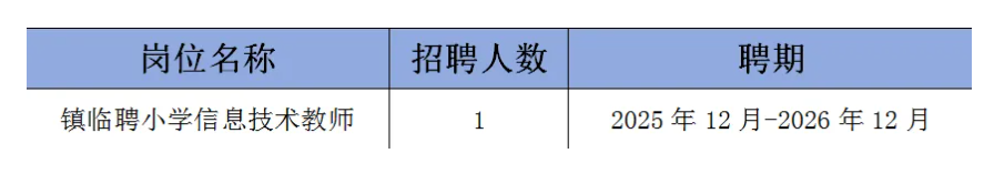 根据2025年秋季教学需求,学校决定面向全国公开招聘镇临聘小学信息技术教师1名,现将有关事项公告如下: