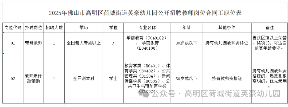 佛山市高明区荷城街道英豪幼儿园创办于1999年,位于荷城跃华路怡安巷18号,由高明区教育局举办的一所公办幼儿园,是佛山市一级幼儿园、广东省规范化幼儿园、佛山市三星级公益普惠性幼儿园。幼儿园环境优美,设施配套齐全,园舍宽敞明亮,活动区域设置科学合理,深得家长和孩子的喜欢。因业务发展需要,2026年春季学期需面向社会招聘幼儿教师2名,我们将提供专业的业务引领、具有竞争力的薪酬待遇、和谐的园所文化、积极向上的工作氛围。如果您和我们一样热爱幼教事业,欢迎您加入我们的队伍!
