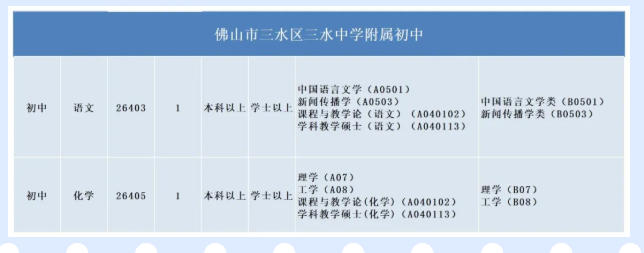 根据工作需要,三水中学附属初中面向2026年高校应届毕业生招聘教师2名,本场招聘在湖南长沙设点,其中,语文教师1名,化学教师1名。获聘人员为事业单位编制工作人员,聘为专业技术岗位12级以上,主要从事学科教学及教育管理工作,享受国家政策规定的薪酬待遇。
