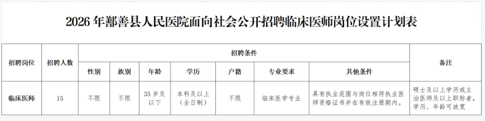 本次公开招聘有执业医师资格临床医师专业技术人员,具体岗位要求详见《2026年鄯善县人民医院面向社会公开招聘临床医师岗位设置计划表》(附件1)