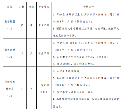 根据《青海省公安机关警务辅助人员管理条例》及相关规定,结合当前公安工作需要,都兰县公安局决定面向社会公开招聘43名警务辅助人员(以下简称“辅警”),现将有关招聘事项公告如下: