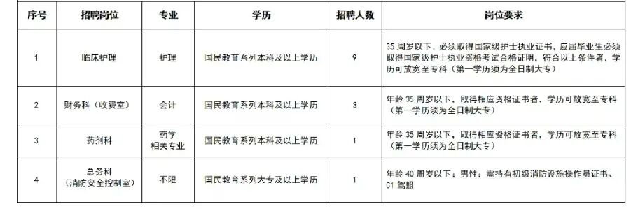 招聘人数:公开招聘编外专业技术人员14名,其中临床护理岗位9人,财务科(收费室)3人,药剂科1人,总务科(消防安全控制室)1人。详细招聘需求计划见附表。