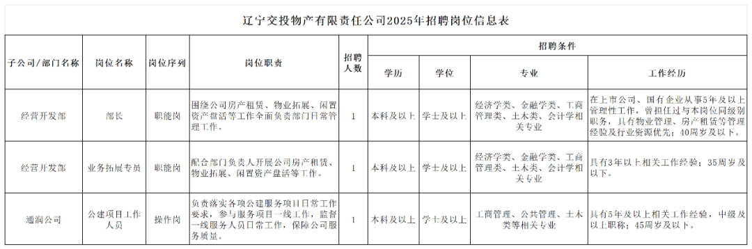 7.符合具体招聘岗位所需要的其他条件(详见《辽宁交投物产有限责任公司2025年招聘岗位信息表》,招聘条件要求具有相关工作经历的,年限计算的截止时间为2025年9月30日)。