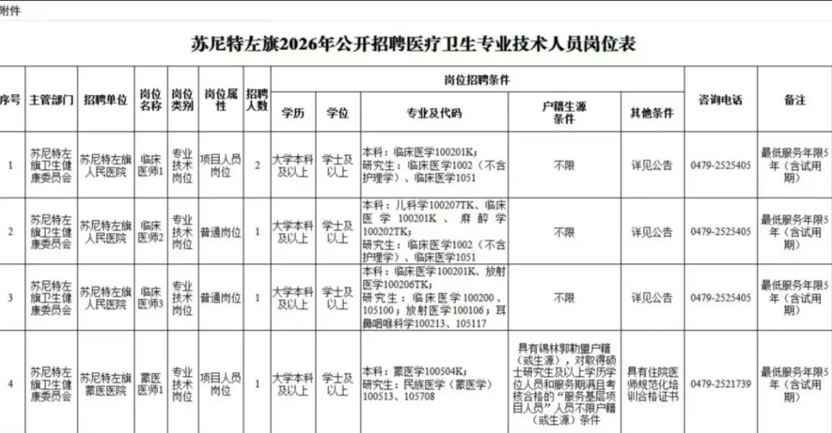 根据《内蒙古自治区事业单位公开招聘人员办法》《关于启动2026年全区事业单位公开招聘工作的通知》有关规定,现将苏尼特左旗2026年公开招聘医疗卫生专业技术人员事宜公告如下: