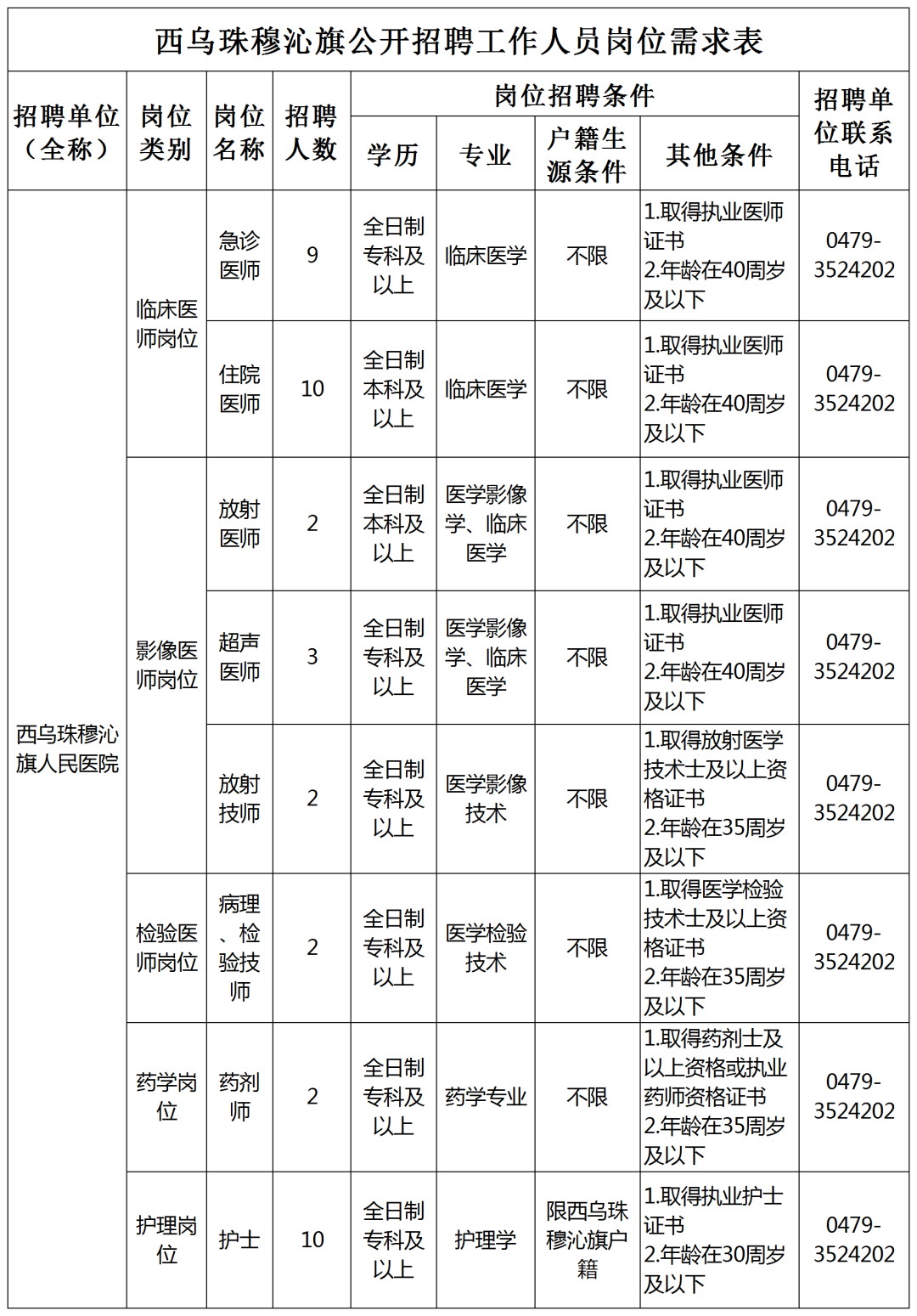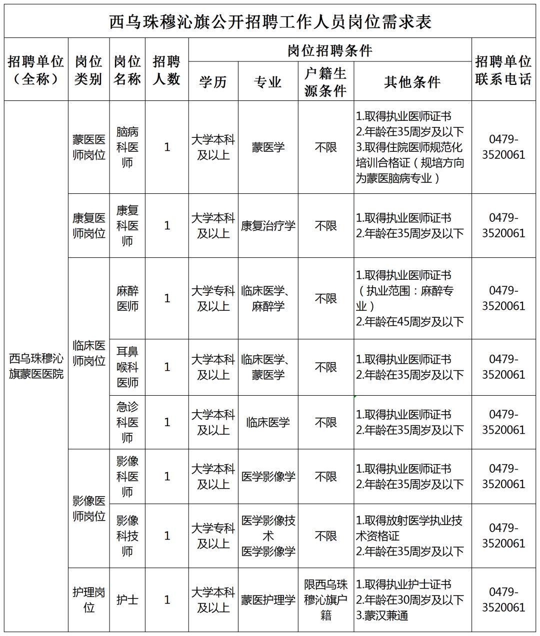 本次共招聘医疗卫生专业技术人员48人,其中:旗人民医院40人、蒙医医院8人,具体岗位及条件详见岗位需求表(附件1、附件2)。