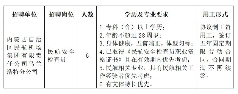 现根据乌兰浩特机场发展需要,面向社会公开招聘6名协议制民航安全检查员,有关事项公告如下: