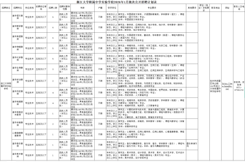 7.具备招聘岗位要求的其他条件,详见《浙江大学附属中学教育集团2026年1月批次公开招聘计划表》(附件1)。