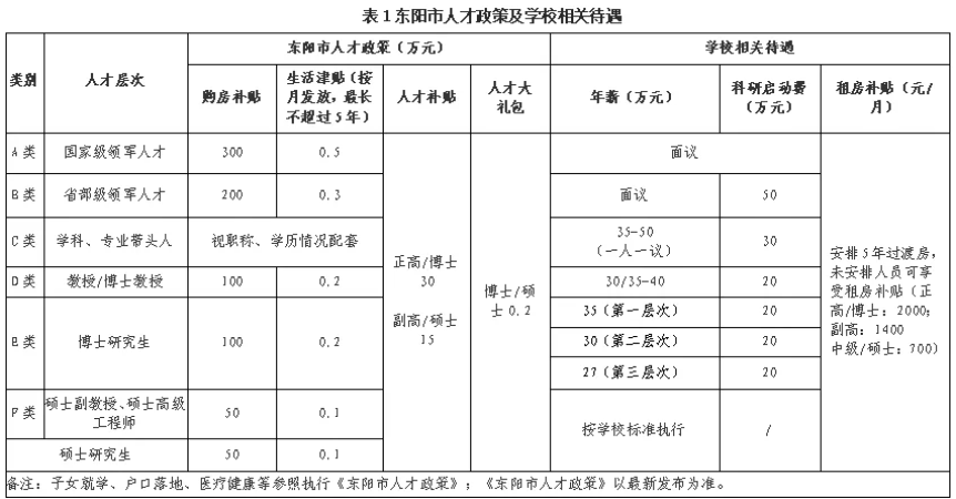 1.聘用人员除按学校薪资制度规定享受工资、保险等福利待遇外,学校还根据聘用人员的水平和层次提供科研启动经费等待遇。符合东阳市人才政策,可申领购房补贴、人才补贴等人才奖励资助(《东阳市人才政策》以最新发布为准)。