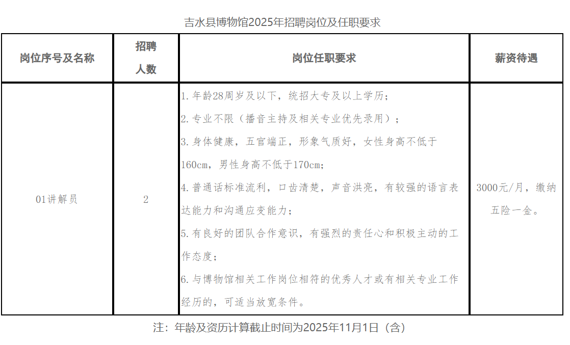 详见附件《吉水县博物馆2025年招聘岗位及任职要求》。本次招考年龄计算方法为:28周岁及以下是指1996年11月1日(含)以后出生,招聘岗位要求毕业证书或资格证书获取的时间截至2025年11月1日(含)。特别优秀者经研究决定后可适当放宽相关条件。
