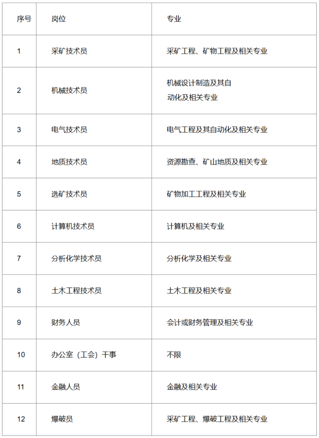 详见《宝山矿业2026年公开招聘岗位计划表》(附件1)。