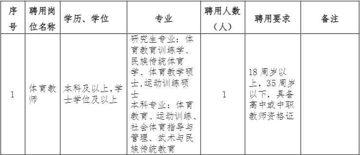 根据学校发展需要,我校面向社会诚招体育教师1名,现将有关事项公告如下: