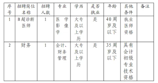 (五)符合岗位所需的年龄要求(如财务科人员需35周岁及以下、B超诊断医生40周岁及以下等);