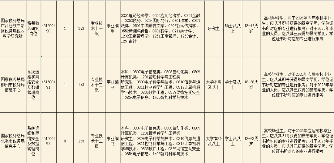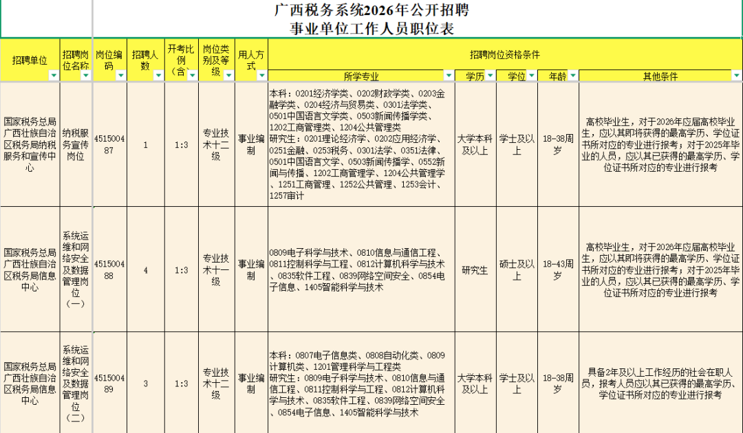 《国家税务总局广西壮族自治区税务系统2026年度公开招聘事业单位工作人员通告》已发布,国家税务总局广西壮族自治区税务系统共设置10个岗位,计划招聘20人,主要招录专业涵盖经济学类、计算机类、中国语言文学类、电子信息类和新闻传播学类等。详情请看岗位简表!