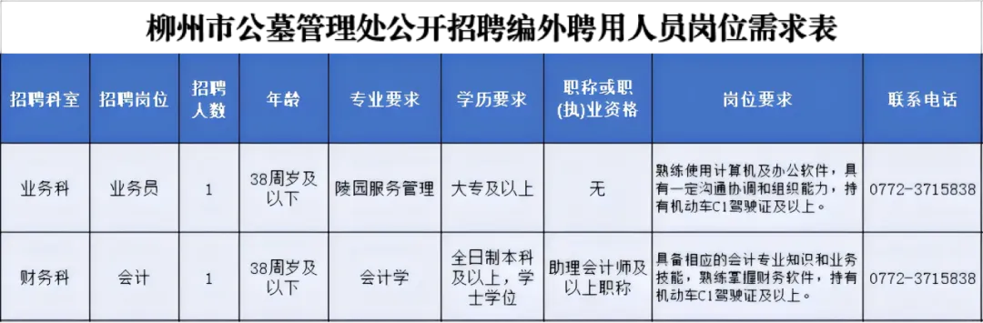 本次报名仅采取电子邮件报名方式进行,不收任何费用。应聘者须填写柳州市公墓管理处招聘编外人员登记表(点击链接下载报名表),填写后编辑成PDF文档投递至我单位邮箱lslybg@163.com。报名材料(PDF格式)应以“姓名+应聘岗位”格式命名,报名材料命名方式与邮件主题相同。简历内应附有佐证材料:本人毕业证、学位证、职称或职(执)业资格、奖项证书等复印件或扫描件。未按要求投递简历将视为无效简历。