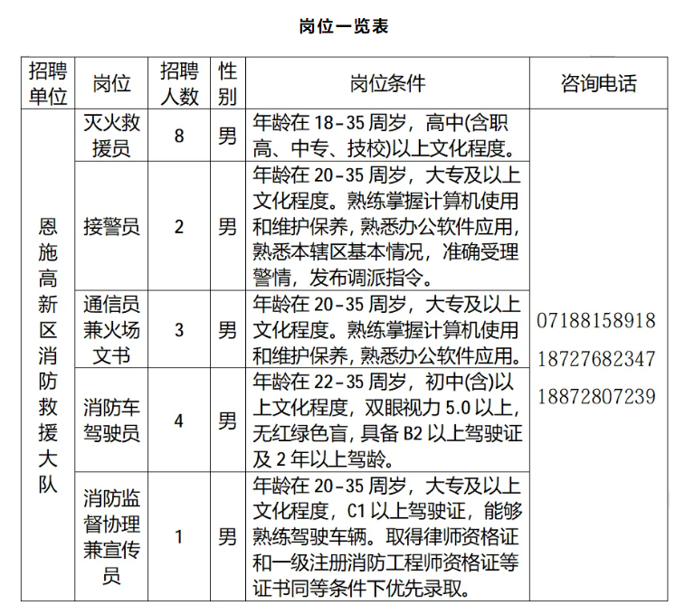 为满足恩施高新区社会经济迅速发展对消防救援力量的需求,积极适应新形势新任务,结合恩施高新区火灾防控、灭火救援和应急值守工作实际,面向社会招录政府专职消防员18人,现将有关事项公告如下: