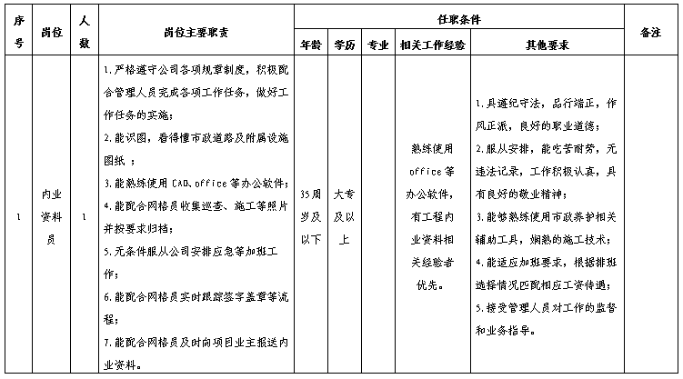 因公司业务扩展需要,我司决定面向社会招聘1名内业资料员,用工性质为劳务外包,现将有关事项公告如下: