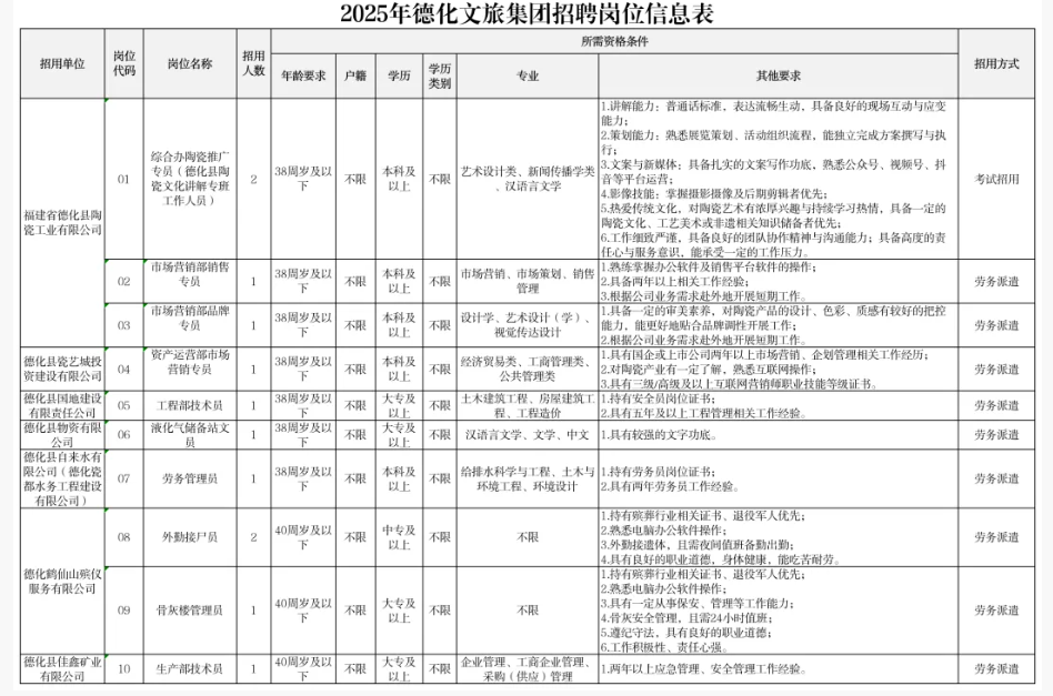 德化文旅集团有限公司于2019年9月注册成立,为具有独立法人资格的国有独资企业。主要从事陶瓷文化、旅游康养、水务发展、投资运营、民生服务五大板块业务,公司注册资本为5亿元,现有一级子公司18家,二级子公司10家,参股企业17家。现因工作需要,德化文旅集团有限公司及权属企业拟向社会公开招聘一批工作人员。具体公告如下: