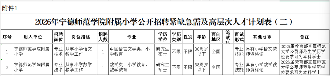 附件1:2026年宁德师范学院附属小学公开招聘紧缺急需及高层次人才计划表(二).xls