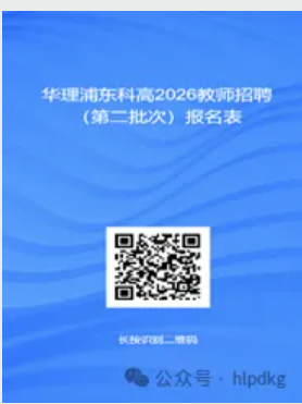 本次招聘采取网络报名方式进行,请扫码以下二维码,如实填写《华理浦东科高2026教师招聘(第二批次)报名表》,并将个人简历(命名格式:“学科+姓名+学历+毕业院校”)发送至邮箱: