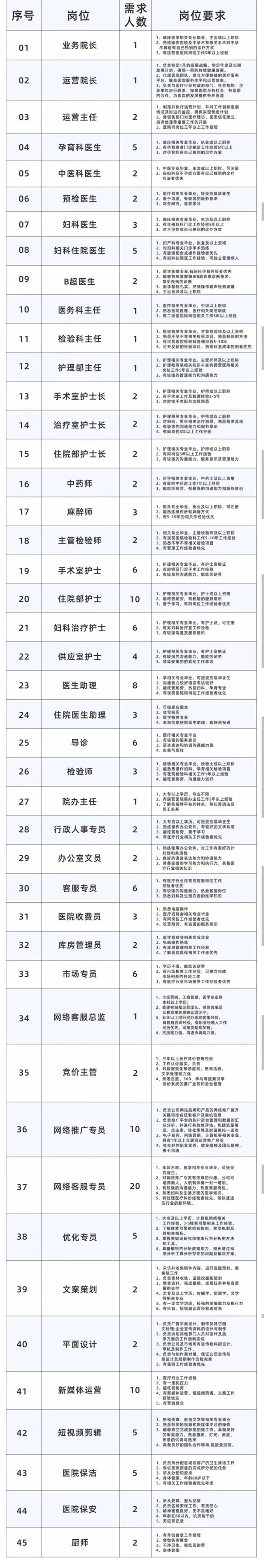 1.医学相关专业毕业,可接受应届毕业生;2.沟通能力较好,语言表达好;3.能吃苦耐劳,热爱妇科、孕育专业;4.有民营医院同岗位工作经验者优先。