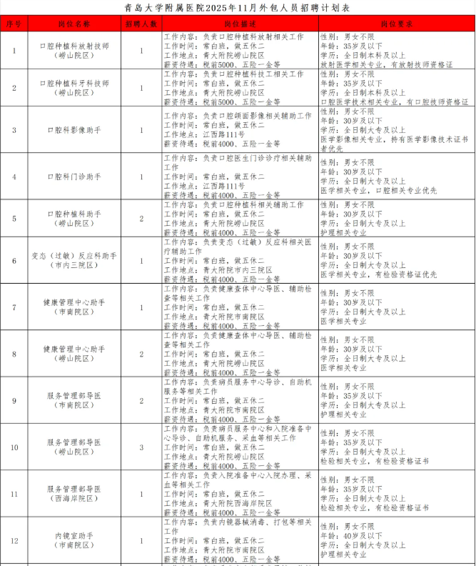 详见附件《青岛大学附属医院2025年11月外包人员招聘计划表》