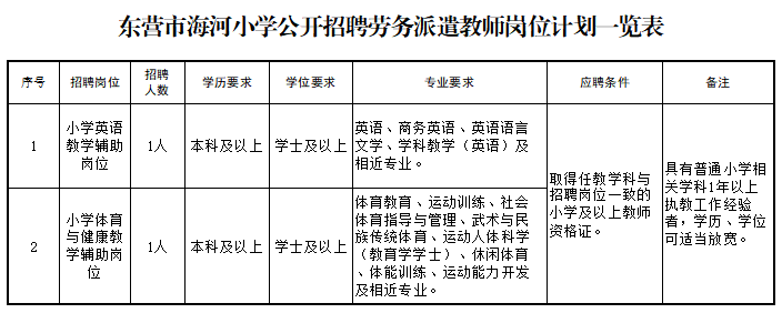 招聘工作人员的岗位条件、招聘人数等具体要求见《东营市海河小学公开招聘劳务派遣教师岗位计划一览表》。