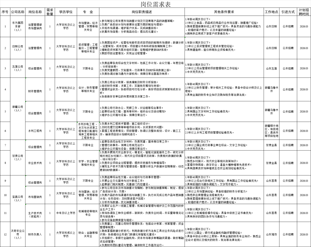 山东土地东方发展集团有限公司是山东省土地发展集团有限公司的八家子集团之一,总部位于山东日照。公司坚守“红色国企”定位,坚决贯彻山东土地集团党委部署,立足国家生态治理与产业发展需求,突出功能型平台作用,与省内外地方政府互信合作,积极发展土地综合整治、绿色矿山治理修复及开发、文冠果全产业链三大产业,为地方经济高质量发展提供资金支持和要素保障,业务布局遍及山东、海南、甘肃、新疆、内蒙古、广西、云南、西藏等地,累计实现营业收入61.85亿元,利润总额14.15亿元,资产总额达到67.02亿元。现根据业务发展需要,公开招聘优秀人才。