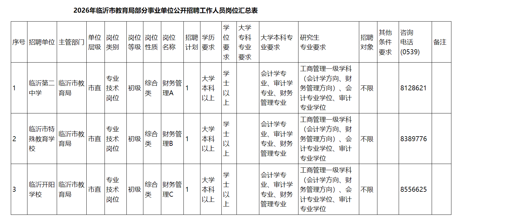 根据事业单位公开招聘工作有关规定,经研究确定,2026年临沂市教育局部分事业单位公开招聘综合类岗位工作人员3名。现将有关事项公告如下: