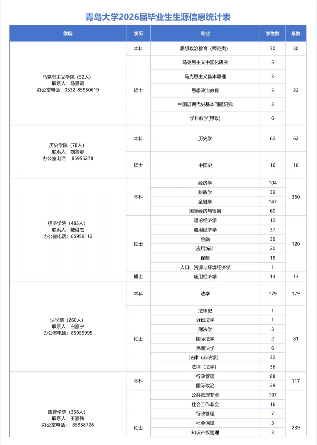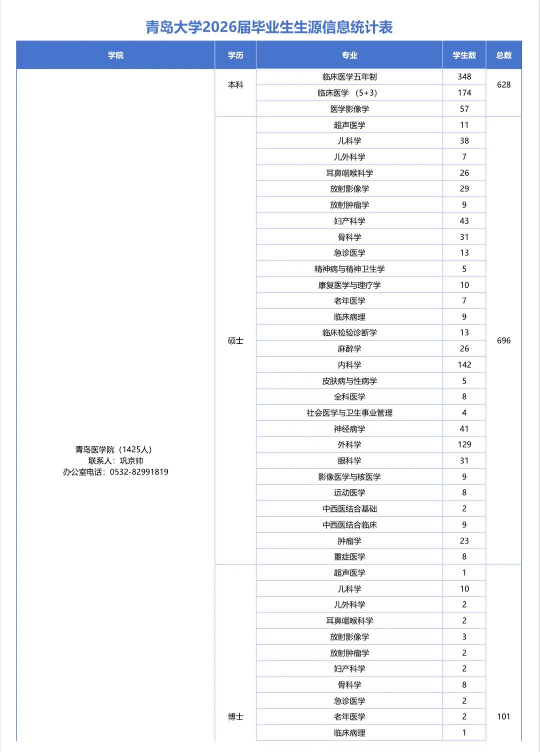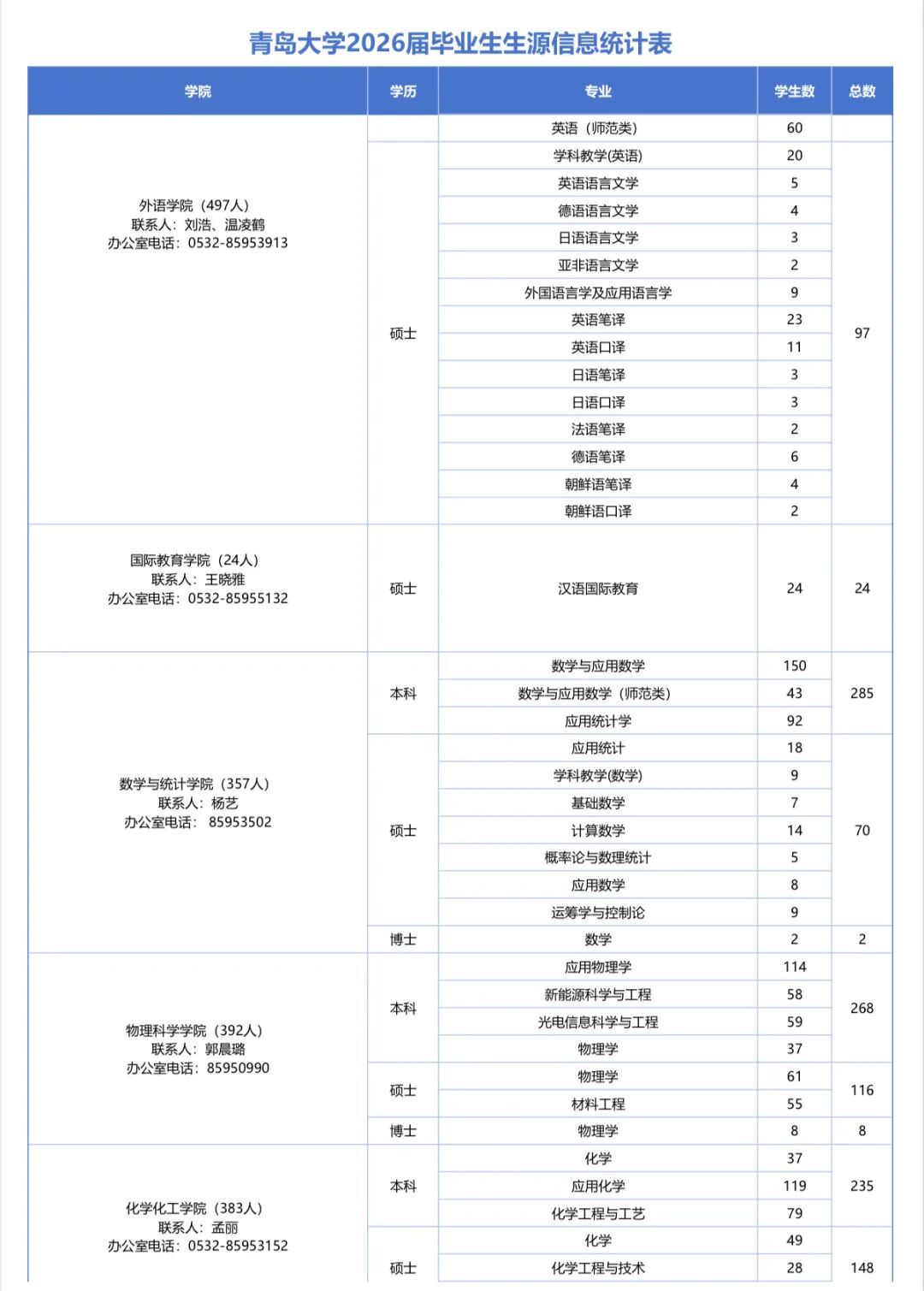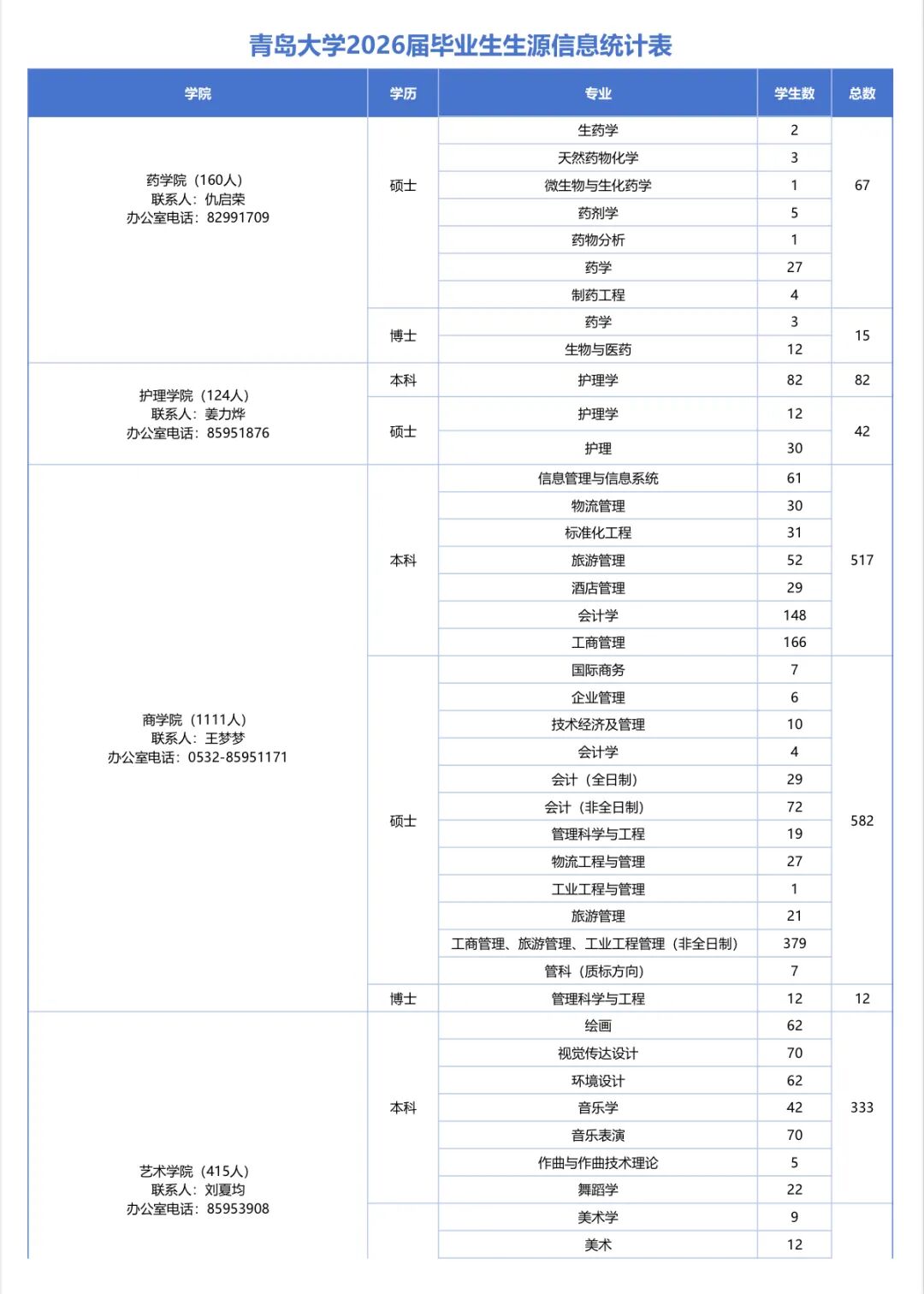 学校2026届毕业生数量为11593人,其中本科毕业生7206人,硕士研究生毕业生4129人,博士研究生毕业生258人,各专业详细毕业生概况请查看附件“青岛大学2026届毕业生生源信息统计表”。