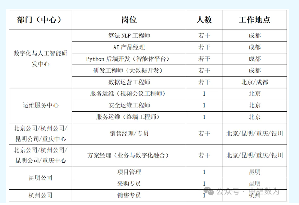 中铝数为(成都)科技有限责任公司(简称中铝数为)是中国铝业集团有限公司(简称中铝集团)全资子公司,是中铝集团数字化转型的承载主体,主要业务包括应用软件、云计算、信息安全技术的开发及技术服务;计算机信息系统集成及相关服务;智能装备、自动化设备、检测设备、仪器仪表、机器人的研发及技术咨询服务;数字化系统运维服务;数字化项目实施等。根据工作需要,现面向社会公开招聘部分岗位人员,现将有关事项公告如下: