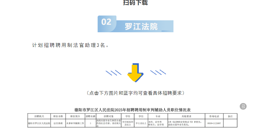 根据工作需要,德阳市中级人民法院、罗江区人民法院拟面向社会公开招聘聘用制审判辅助人员共5名。其中警务辅助人员2名,法官助理3名。