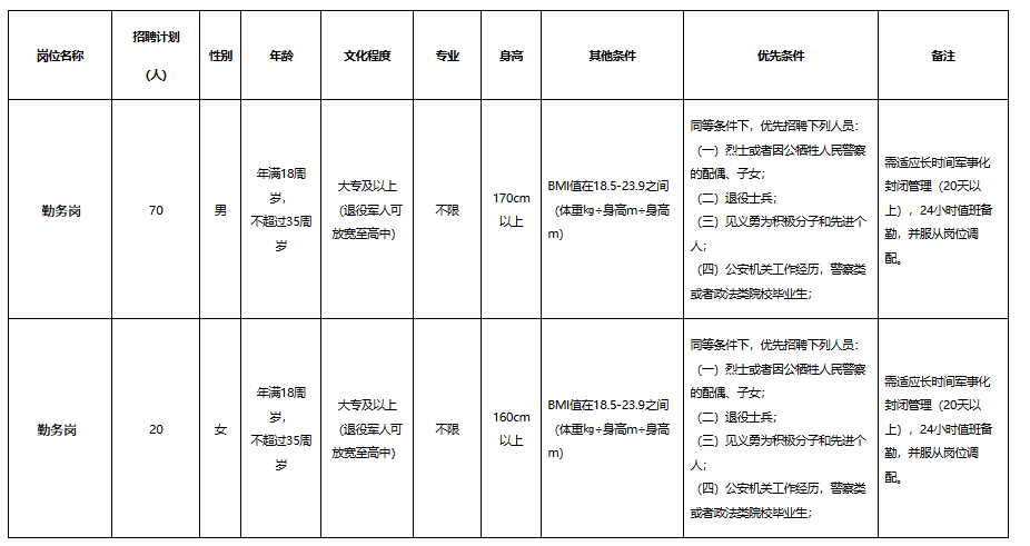 1.具有中华人民共和国国籍;2.拥护中国共产党的领导和中华人民共和国宪法,遵守法律、法规,品行端正;3.年满18周岁、不超过35周岁;4.具有大专及以上文化程度(退役军人可放宽至高中);5.具有能正常履行岗位职责的身体条件、心理素质和工作能力,具有良好的政治素质和道德品行;6.能适应留置看护、值班等勤务要求,服从单位安排的任务,服从单位岗位调整安排;7.男性身高不低于1.70米;女性身高不低于1.60米。