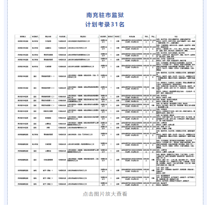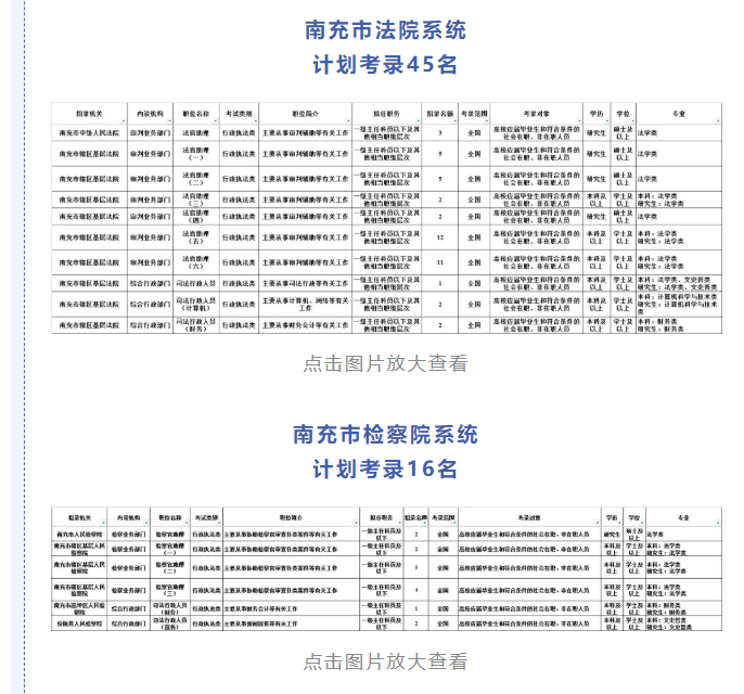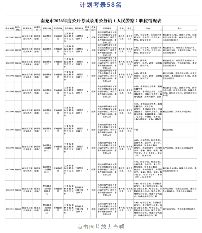 本次公务员考录,全省法院、检察院、公安、司法行政系统(含监狱、戒毒场所)计划面向社会考录公务员(简称“政法系统公招”)3000余名。其中,南充市法院系统计划考录45名,检察院系统计划考录16名,公安系统(含特警专业人才)计划考录64名,南充驻市监狱计划考录31名。