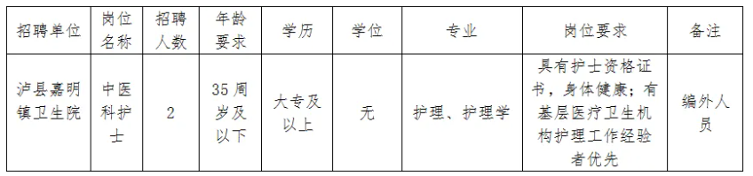 泸县嘉明镇卫生院因工作原因,需招聘编外人员,招聘条件如下: