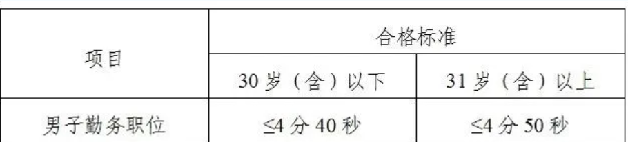 体能测试项目为1000米跑,体能测试合格标准见下表,测试次数只有1次。